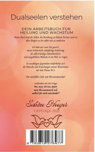 Das Buch - Dualseelenliebe verstehen - Ein Arbeitsbuch für Heilung und Wachstum - wird Dir helfen, die Dualseelen-Beziehung zu Deinem Partner und vor allen Dingen zu Dir selbst neu zu entdecken. Besonders wenn Deine größte Liebe scheinbar Deine größte Herausforderung darstellt und Dein Herzensmensch zwar Dein größtes Glück ist, aber Dir gleichzeitig all Deine Energie raubt, ist dieses Buch für Dich ein wahrer Schatz. Die leicht verständlich aufeinander aufbauenden Kapitel helfen Dir - durch gezielte Aufgaben und Übungen-, Dich zunehmend selbst besser kennen zu lernen. Wer bist Du in diesem Prozess? Mit dem Titel und mit dem Zusatz - Ein Arbeitsbuch - habe ich mir zum Ziel gesetzt, meine langjährige Erfahrung als selbstständige Lebensberaterin und ausgebildetes Medium in die Welt zu tragen. In unzähligen Gesprächen wiederholen sich die Wünsche und Erwartungen meiner Klienten mit dem Thema Nr.1: Die unerfüllte Liebe zum Herzensmenschen! Immer direkt verbunden mit der Frage: Was muss ich tun, damit ich diese herausragende Liebe endlich leben kann? Das bewusste Arbeiten mit diesem Buch wird Dir praktische Schlüssel zum Öffnen von bisher Unbekanntem überreichen. Nimm Dir ausreichend Zeit für die Aufgaben und Übungen, es wird sich lohnen. Die neuen Erfahrungen, das neue Wissen werden Dir auf Deinen weiteren Lebensweg behilflich sein.