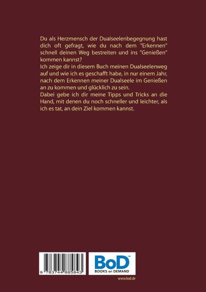 Du als Herzmensch der Dualseelenbegegnung hast dich oft gefragt, wie du nach dem "Erkennen" schnell deinen Weg bestreiten und ins "Genießen" kommen kannst?Ich zeige dir in diesem Buch meinen Dualseelenweg auf und wie ich es geschafft habe, in nur einem Jahr, nach dem Erkennen meiner Dualseele im Genießen an zu kommen und glücklich zu sein.Dabei gebe ich dir meine Tipps und Tricks an die Hand, mit denen du noch schneller und leichter, als ich es tat, an dein Ziel kommen kannst.
