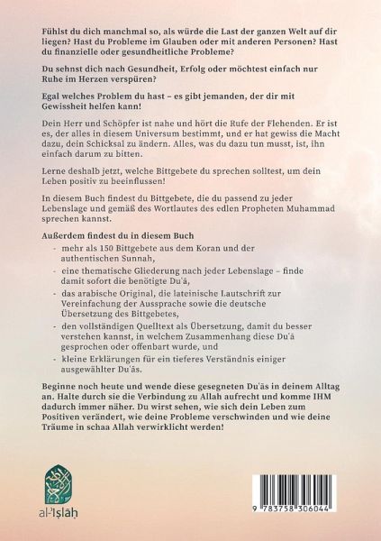 Fühlst du dich manchmal, als trüge die Last der Welt auf deinen Schultern? Probleme im Glauben, mit anderen Menschen, finanzielle oder gesundheitliche Sorgen? Sehnst du dich nach Gesundheit, Erfolg oder innerer Ruhe?Egal, welches Hindernis dich plagt ? es gibt Hilfe!Dein Herr und Schöpfer ist nah, hört deine Rufe. Er bestimmt alles im Universum und hat die Macht, dein Schicksal zu ändern. Alles, was du tun musst, ist darum zu bitten.Erfahre, welche Bittgebete dein Leben positiv beeinflussen können! Dieses Buch enthält Gebete für verschiedene Lebenssituationen, inspiriert von den Worten des edlen Propheten Muhammad.Du findest Duas für:Stärkung des GlaubensSchutz der KinderStress und ErmüdungSchuldenKummer und TrauerNotlagenKrankheitZufriedenheitVergebungAlltagssituationenDas Buch bietet:Über 150 Bittgebete aus dem Koran und authentischer SunnahThematische Gliederung für schnelles Finden der benötigten DuaArabisches Original, lateinische Lautschrift und deutsche ÜbersetzungQuelltextübersetzung für besseres VerständnisErklärungen ausgewählter DuasWende diese gesegneten Duas an und stärke deine Verbindung zu Allah. Dein Leben wird sich positiv verändern, Probleme verschwinden, Träume werden wahr! Starte jetzt deine Reise zu einem positiven, erfüllten Leben!