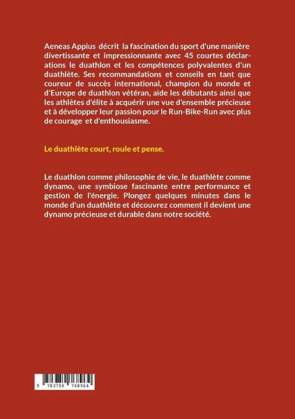 Aeneas Appius décrit la fascination du sport d'une manière divertissante et impressionnante avec 45 courtes déclarations le duathlon et les compétences polyvalentes d'un duathlète. Ses recommandations et conseils en tant que coureur de succès international, champion du monde et d'Europe de duathlon vétéran, aide les débutants ainsi que les athlètes d'élite à acquérir une vue d'ensemble précieuse et à développer leur passion pour le Run-Bike-Run avec plus de courage et d'enthousiasme. Le duathlète court, roule et pense. Le duathlon comme philosophie de vie, le duathlète comme dynamo, une symbiose fascinante entre performance et gestion de l'énergie. Plongez quelques minutes dans le monde d'un duathlète et découvrez comment il devient une dynamo précieuse et durable dans notre société.
