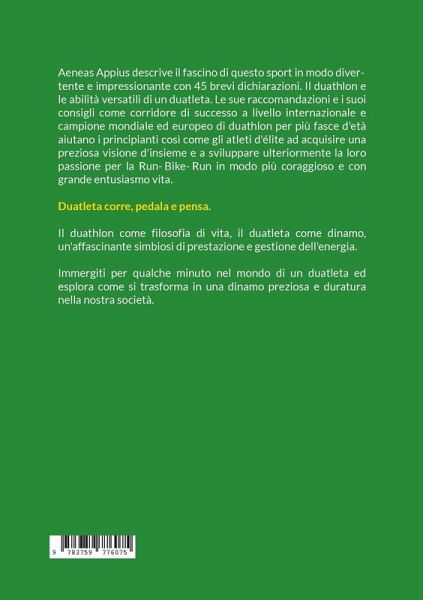 Aeneas Appius descrive il fascino di questo sport in modo divertente e impressionante con 45 brevi dichiarazioni. Il duathlon e le abilità versatili di un duatleta. Le sue raccomandazioni e i suoi consigli come corridore di successo a livello internazionale e campione mondiale ed europeo di duathlon per più fasce d'età aiutano i principianti così come gli atleti d'élite ad acquisire una preziosa visione d'insieme e a sviluppare ulteriormente la loro passione per la Run-Bike-Run in modo più coraggioso e con grande entusiasmo vita. Duatleta corre, pedala e pensa. Il duathlon come filosofia di vita, il duatleta come dinamo, un'affascinante simbiosi di prestazione e gestione dell'energia. Immergiti per qualche minuto nel mondo di un duatleta ed esplora come si trasforma in una dinamo preziosa e duratura nella nostra società.