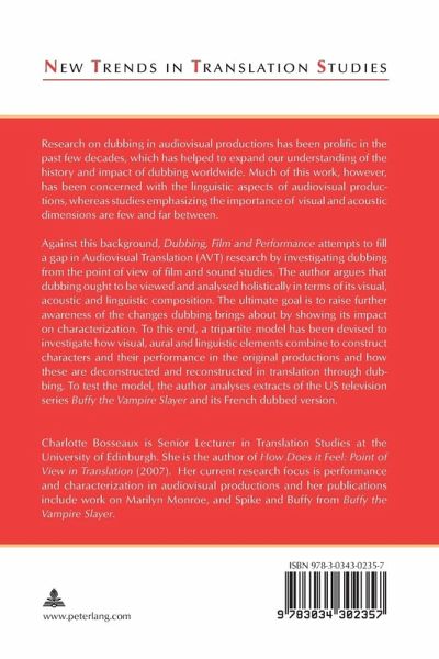 Against this background, Dubbing, Film and Performance attempts to fill a gap in Audiovisual Translation (AVT) research by investigating dubbing from the point of view of film and sound studies. The author argues that dubbing ought to be viewed and analysed holistically in terms of its visual, acoustic and linguistic composition. The ultimate goal is to raise further awareness of the changes dubbing brings about by showing its impact on characterization. To this end, a tripartite model has been devised to investigate how visual, aural and linguistic elements combine to construct characters and their performance in the original productions and how these are deconstructed and reconstructed in translation through dubbing. To test the model, the author analyses extracts of the US television series Buffy the Vampire Slayer and its French dubbed version.
