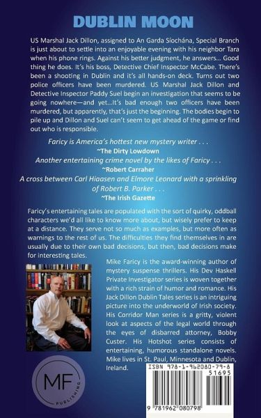 Dublin Moon: Jack Dillon Dublin Tale 10, Second Edition US Marshal Jack Dillon, assigned to An Garda Síochána, Special Branch, is just about to settle into an enjoyable evening with his neighbor Tara when his phone rings. Against his better judgment, he answers... Good thing he does. It's his boss, Detective Chief Inspector McCabe. There's been a shooting in Dublin and it's all hands on deck. Turns out two police officers have been murdered. US Marshal Jack Dillon and Detective Inspector Paddy Suel begin an investigation that seems to be going nowhere- and yet... It's bad enough two officers have been murdered, but apparently, that's just the beginning. The bodies begin to pile up and Dillon and Suel can't seem to get ahead of the game or find out who is responsible. Faricy is America's hottest new mystery writer . . . ~The Dirty Lowdown Another entertaining crime novel by the likes of Faricy . . . ~Robert Carraher A cross between Carl Hiaasen and Elmore Leonard with a sprinkling of Robert B. Parker . . . ~The Irish Gazette Faricy's entertaining tales are populated with the sort of quirky, oddball characters we'd all like to know more about but wisely prefer to keep at a distance. They serve not so much as examples but more often as warnings to the rest of us. The difficulties they find themselves in are usually due to their own bad decisions, but bad decisions make for interesting tales. ¿¿¿¿