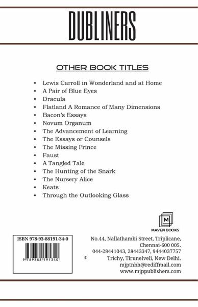 The Sisters, An Encounter, Araby, Eveline, After the Race, Two Gallants, The Boarding House, A Little Cloud, Counterparts, Clay, A Painful Case, Ivy Day in the Committee Room, A Mother, Grace, The Dead