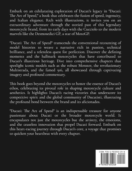 Embark on an exhilarating exploration of Ducati's legacy in "Ducati: The Art of Speed," a book that celebrates the fusion of speed, ingenuity, and Italian elegance. Rich with illustrations, it invites you on an extraordinary adventure through the storied past of this legendary motorcycle brand, from its early days with the Cucciolo to the modern marvels like the Desmosedici GP, a star of MotoGP. "Ducati: The Art of Speed" transcends the conventional recounting of model histories to weave a narrative rich in passion, technical brilliance, and a relentless quest for perfection. Discover the defining moments and the hallmark motorcycles that have contributed to Ducati's illustrious heritage. Dive into comprehensive chapters that spotlight iconic models such as the robust Monster, the revolutionary Multistrada, and the famed 916, all showcased through captivating imagery and profound commentary. This book goes beyond the motorcycles to honor the essence of Ducati's ethos, celebrating its pivotal role in shaping motorcycle culture and aesthetics. It highlights Ducati's racing victories that underscore its competitive spirit and the global community of Ducatisti, illustrating the profound bond between the brand and its aficionados. "Ducati: The Art of Speed" is an indispensable treasure for anyone passionate about Ducati or the broader motorcycle world. It encapsulates not just the motorcycles but the artistry, the emotions, and the ceaseless innovation that propel Ducati forward. Embark on this heart-racing journey through Ducati's core, a voyage that promises to quicken your heartbeat with every chapter.