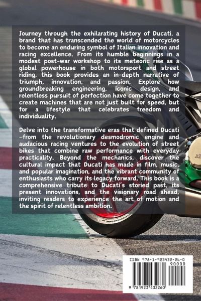 Journey through the exhilarating history of Ducati, a brand that has transcended the world of motorcycles to become an enduring symbol of Italian innovation and racing excellence. From its humble beginnings in a modest post-war workshop to its meteoric rise as a global powerhouse in both motorsport and street riding, this book provides an in-depth narrative of triumph, innovation, and passion. Explore how groundbreaking engineering, iconic design, and relentless pursuit of perfection have come together to create machines that are not just built for speed, but for a lifestyle that celebrates freedom and individuality. Delve into the transformative eras that defined Ducati-from the revolutionary desmodromic engine and audacious racing ventures to the evolution of street bikes that combine raw performance with everyday practicality. Beyond the mechanics, discover the cultural impact that Ducati has made in film, music, and popular imagination, and the vibrant community of enthusiasts who carry its legacy forward. This book is a comprehensive tribute to Ducati's storied past, its present innovations, and the visionary road ahead, inviting readers to experience the art of motion and the spirit of relentless ambition.