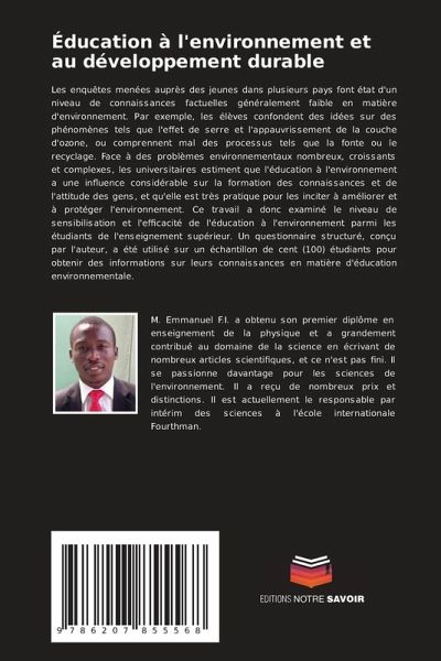 Les enquêtes menées auprès des jeunes dans plusieurs pays font état d'un niveau de connaissances factuelles généralement faible en matière d'environnement. Par exemple, les élèves confondent des idées sur des phénomènes tels que l'effet de serre et l'appauvrissement de la couche d'ozone, ou comprennent mal des processus tels que la fonte ou le recyclage. Face à des problèmes environnementaux nombreux, croissants et complexes, les universitaires estiment que l'éducation à l'environnement a une influence considérable sur la formation des connaissances et de l'attitude des gens, et qu'elle est très pratique pour les inciter à améliorer et à protéger l'environnement. Ce travail a donc examiné le niveau de sensibilisation et l'efficacité de l'éducation à l'environnement parmi les étudiants de l'enseignement supérieur. Un questionnaire structuré, conçu par l'auteur, a été utilisé sur un échantillon de cent (100) étudiants pour obtenir des informations sur leurs connaissances en matière d'éducation environnementale.