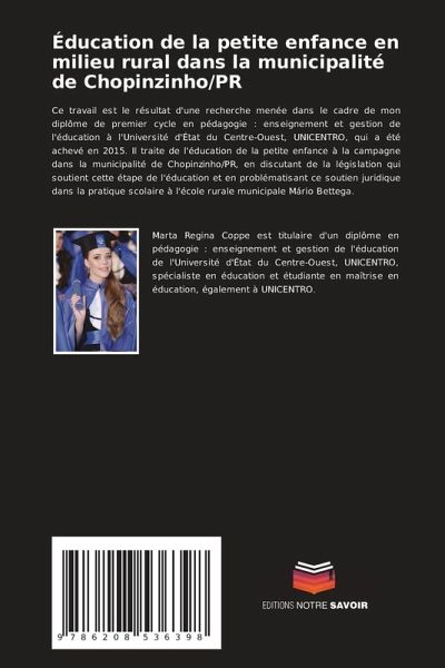 Ce travail est le résultat d'une recherche menée dans le cadre de mon diplôme de premier cycle en pédagogie : enseignement et gestion de l'éducation à l'Université d'État du Centre-Ouest, UNICENTRO, qui a été achevé en 2015. Il traite de l'éducation de la petite enfance à la campagne dans la municipalité de Chopinzinho/PR, en discutant de la législation qui soutient cette étape de l'éducation et en problématisant ce soutien juridique dans la pratique scolaire à l'école rurale municipale Mário Bettega.