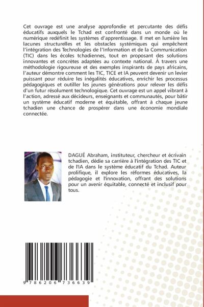 Cet ouvrage est une analyse approfondie et percutante des défis éducatifs auxquels le Tchad est confronté dans un monde où le numérique redéfinit les systèmes d'apprentissage. Il met en lumière les lacunes structurelles et les obstacles systémiques qui empêchent l'intégration des Technologies de l'Information et de la Communication (TIC) dans les écoles tchadiennes, tout en proposant des solutions innovantes et concrètes adaptées au contexte national. À travers une méthodologie rigoureuse et des exemples inspirants de pays africains, l'auteur démontre comment les TIC, TICE et IA peuvent devenir un levier puissant pour réduire les inégalités éducatives, enrichir les processus pédagogiques et outiller les jeunes générations pour relever les défis d'un futur résolument technologique. Cet ouvrage est un appel vibrant à l'action, adressé aux décideurs, enseignants et communautés, pour bâtir un système éducatif moderne et équitable, offrant à chaque jeune tchadien une chance de prospérer dans une économie mondiale connectée.
