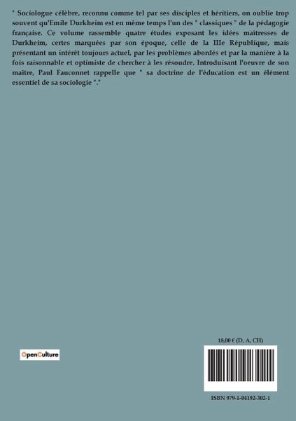 " Sociologue célèbre, reconnu comme tel par ses disciples et héritiers, on oublie trop souvent qu'Emile Durkheim est en même temps l'un des " classiques " de la pédagogie française. Ce volume rassemble quatre études exposant les idées maîtresses de Durkheim, certes marquées par son époque, celle de la IIIe République, mais présentant un intérêt toujours actuel, par les problèmes abordés et par la manière à la fois raisonnable et optimiste de chercher à les résoudre. Introduisant l'oeuvre de son maître, Paul Fauconnet rappelle que " sa doctrine de l'éducation est un élément essentiel de sa sociologie "."