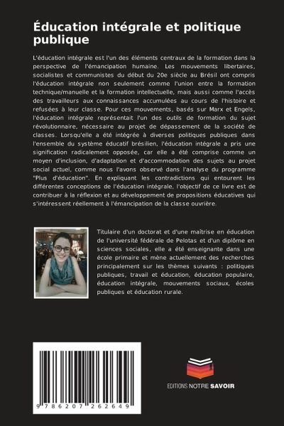 L'éducation intégrale est l'un des éléments centraux de la formation dans la perspective de l'émancipation humaine. Les mouvements libertaires, socialistes et communistes du début du 20e siècle au Brésil ont compris l'éducation intégrale non seulement comme l'union entre la formation technique/manuelle et la formation intellectuelle, mais aussi comme l'accès des travailleurs aux connaissances accumulées au cours de l'histoire et refusées à leur classe. Pour ces mouvements, basés sur Marx et Engels, l'éducation intégrale représentait l'un des outils de formation du sujet révolutionnaire, nécessaire au projet de dépassement de la société de classes. Lorsqu'elle a été intégrée à diverses politiques publiques dans l'ensemble du système éducatif brésilien, l'éducation intégrale a pris une signification radicalement opposée, car elle a été comprise comme un moyen d'inclusion, d'adaptation et d'accommodation des sujets au projet social actuel, comme nous l'avons observé dans l'analyse du programme "Plus d'éducation". En expliquant les contradictions qui entourent les différentes conceptions de l'éducation intégrale, l'objectif de ce livre est de contribuer à la réflexion et au développement de propositions éducatives qui s'intéressent réellement à l'émancipation de la classe ouvrière.