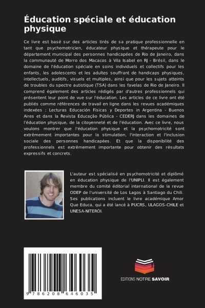 Ce livre est basé sur des articles tirés de sa pratique professionnelle en tant que psychomotricien, éducateur physique et thérapeute pour le département municipal des personnes handicapées de Rio de Janeiro, dans la communauté de Morro dos Macacos à Vila Isabel en RJ - Brésil, dans le domaine de l'éducation spéciale en soins individuels et collectifs pour les enfants, les adolescents et les adultes souffrant de handicaps physiques, intellectuels, auditifs, visuels et multiples, ainsi que pour les sujets atteints de troubles du spectre autistique (TSA) dans les favelas de Rio de Janeiro. Il comprend également des articles rédigés par d'autres professionnels qui présentent leur point de vue sur l'éducation. Les articles de ce livre ont été publiés comme références de travail en ligne dans les revues académiques indexées : Lecturas Educación Físicas y Deportes in Argentina - Buenos Aires et dans la Revista Educação Pública - CEDERJ dans les domaines de l'éducation physique, de la citoyenneté et de l'éducation. Avec ce livre, nous voulons montrer que l'éducation physique et la psychomotricité sont extrêmement importantes pour la stimulation, l'interaction et l'inclusion sociale des personnes handicapées. Et que la disponibilité des professionnels est extrêmement importante pour obtenir des résultats expressifs et concrets.