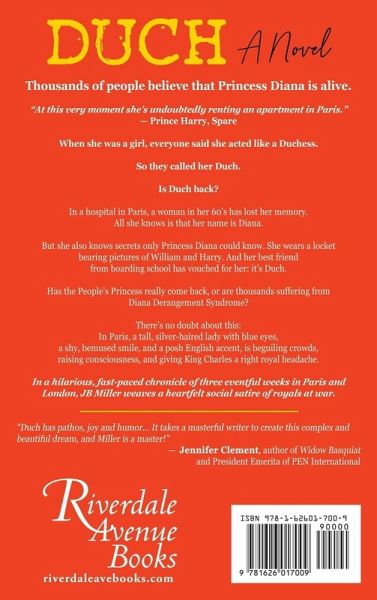 Thousands of people believe that Princess Diana is alive."At this very moment she's undoubtedly renting an apartment in Paris." - Prince Harry, Spare When she was a girl, everyone said she acted like a Duchess. So they called her Duch.Is Duch back? In a hospital in Paris, a woman in her 60's has lost her memory. All she knows is that her name is Diana. But she also knows secrets only Princess Diana could know. She wears a locket bearing pictures of William and Harry. And her best friend from boarding school has vouched for her: it's Duch. Has the People's Princess really come back, or are thousands suffering from Diana Derangement Syndrome? There's no doubt about this: In Paris, a tall, silver-haired lady with blue eyes, a shy, bemused smile, and a posh English accent, is beguiling crowds, raising consciousness, and giving King Charles a right royal headache. In a hilarious, fast-paced chronicle of three eventful weeks in Paris and London, JB Miller weaves a heartfelt social satire of royals at war. "Duch has pathos, joy and humor... It takes a masterful writer to create this complex and beautiful dream, and Miller is a master!"- Jennifer Clement, author of Widow Basquiatand President Emerita of PEN International "Duch works on so many levels: farce, satire, page-turner, reportage, cultural commentary, counterfactual history, punch line. It rings true with all its implausible narratives and has a surprising affection and respect for the royals, for each of their private and royal selves."- John Donatich, author of Ambivalence, A Love Story