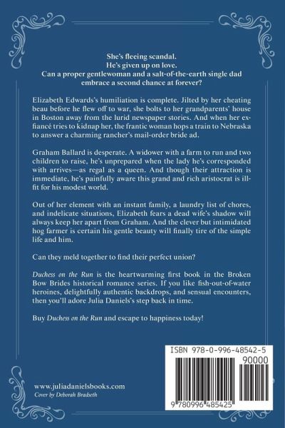 She's fleeing scandal. He's given up on love. Can a proper gentlewoman and a salt-of-the-earth single dad embrace a second chance at forever? Elizabeth Edwards's humiliation is complete. Jilted by her cheating beau before he flew off to war, she bolts to her grandparents' house in Boston away from the lurid newspaper stories. And when her ex-fiancé tries to kidnap her, the frantic woman hops a train to Nebraska to answer a charming rancher's mail-order bride ad. Graham Ballard is desperate. A widower with a farm to run and two children to raise, he's unprepared when the lady he's corresponded with arrives—as regal as a queen. And though their attraction is immediate, he's painfully aware this grand and rich aristocrat is ill-fit for his modest world. Out of her element with an instant family, a laundry list of chores, and indelicate situations, Elizabeth fears a dead wife's shadow will always keep her apart from Graham. And the clever but intimidated hog farmer is certain his gentle beauty will finally tire of the simple life and him. Can they meld together to find their perfect union? Duchess on the Run is the heartwarming first book in the Broken Bow Brides historical romance series. If you like fish-out-of-water heroines, delightfully authentic backdrops, and sensual encounters, then you'll adore Julia Daniels's step back in time.