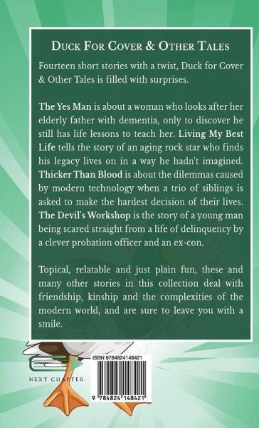 Fourteen short stories with a twist, Duck for Cover & Other Tales is filled with surprises. The Yes Man is about a woman who looks after her elderly father with dementia, only to discover he still has life lessons to teach her. Living My Best Life tells the story of an aging rock star who finds his legacy lives on in a way he hadn't imagined. Thicker Than Blood is about the dilemmas caused by modern technology when a trio of siblings is asked to make the hardest decision of their lives. The Devil's Workshop is the story of a young man being scared straight from a life of delinquency by a clever probation officer and an ex-con. Topical, relatable and just plain fun, these and many other stories in this collection deal with friendship, kinship and the complexities of the modern world, and are sure to leave you with a smile.