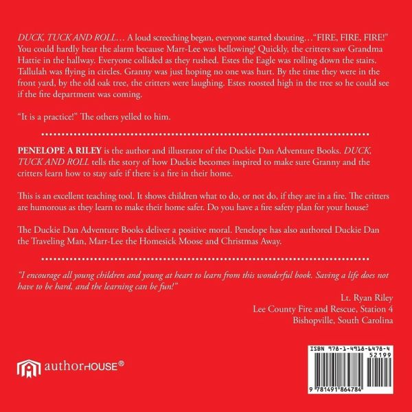 DUCK, TUCK AND ROLL... A loud screeching began, everyone started shouting..."FIRE, FIRE, FIRE!" You could hardly hear the alarm because Marr-Lee was bellowing! Quickly, the critters saw Grandma Hattie in the hallway. Everyone collided as they rushed. Estes the Eagle was rolling down the stairs. Tallulah was flying in circles. Granny was just hoping no one was hurt. By the time they were in the front yard, by the old oak tree, the critters were laughing. Estes roosted high in the tree so he could see if the fire department was coming. "It is a practice!" The others yelled to him. This is an excellent teaching tool. It shows children what to do, or not do, if they are in a fire. The critters are humorous as they learn to make their home safer. Do you have a fire safety plan for your house? The Duckie Dan Adventure Books deliver a positive moral. Penelope has also authored Duckie Dan the Traveling Man, Marr-Lee the Homesick Moose and Christmas Away. "I encourage all young children and young at heart to learn from this wonderful book. Saving a life does not have to be hard, and the learning can be fun!" Lt. Ryan Riley Lee County Fire and Rescue, Station 4 Bishopville, South Carolina