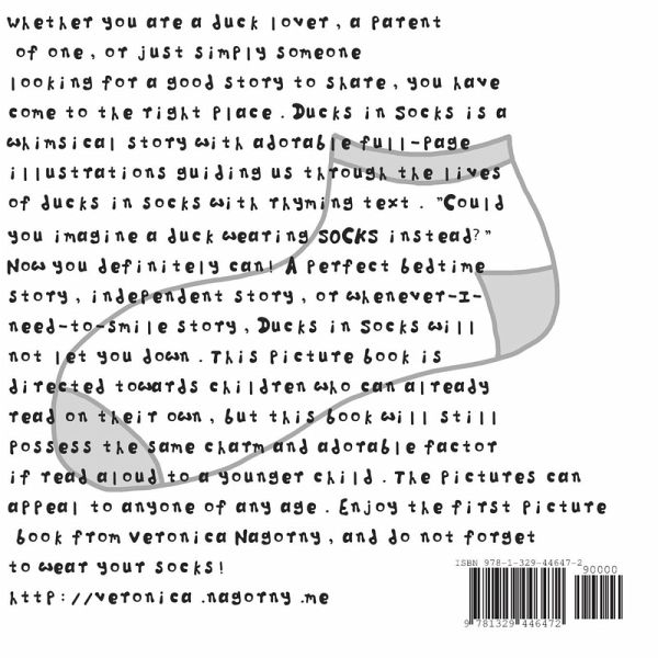Whether you're a duck lover, or the parent of one, or just simply someone looking for a good story to share, you've come to the right place. Ducks in Socks is a whimsical story with adorable full-page illustrations guiding us through the ducks' lives in socks with rhyming text. "Could you imagine a duck wearing SOCKS instead?" Now you definitely can! A perfect bedtime story, independent story, or whenever-I-need-to-smile story, Ducks in Socks will not let you down. This children's book is directed towards children who can already read on their own, but will still possess the same charm and adorable factor if read aloud to a younger child. The pictures can appeal to anyone of any age. Enjoy the very first picture book from Veronica Nagorny and don't forget to wear your socks!