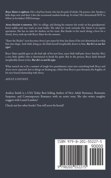 Bryce Slater is eighteen. He's a bad boy hottie who has his pick of chicks. He parties a bit. Smokes a little dope now and then. Likes the occasional random hook-up. So what? He's determined NOT to follow in his father's FBI footsteps. Avery Sinclair is nineteen. She's in college, and during the summer she works on her grandparents' horse stables and race track as team leader. She takes her work seriously. Her future is in equine operations. She has no time for slackers on her team. But thanks to her uncle doing a favor for a friend, Avery ends up with Bryce Slater for the summer. "Slater the Slacker" soon becomes Avery's pet name for him, but damn if she isn't determined to whip him into shape. And while doing so, she finds herself inexplicably drawn to him. But he's so not her type! Bryce Slater quickly gets on the bad side of his new boss, saucy little half-pint Avery Sinclair. She's a sexy little spitfire who is determined to break his spirit. But in the process, Bryce finds himself inexplicably drawn to her. But she's so not his type. What started out to be a summer of tough love punishment, turns into something both Bryce and Avery never expected. Just as things are heating up, a blast from Bryce's past threatens the fragility of his new found relationship with Avery. ADULT CONTENT.