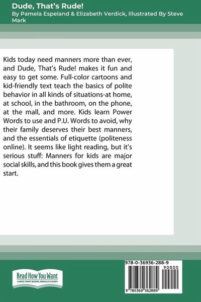 Kids today need manners more than ever, and Dude, That's Rude! makes it fun and easy to get some. Full-color cartoons and kid-friendly text teach the basics of polite behavior in all kinds of situations-at home, at school, in the bathroom, on the phone, at the mall, and more. Kids learn Power Words to use and P.U. Words to avoid, why their family deserves their best manners, and the essentials of e-tiquette (politeness online). It seems like light reading, but it's serious stuff: Manners for kids are major social skills, and this book gives them a great start.