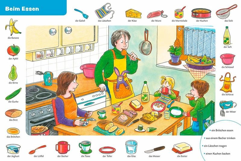 Große Bilder und Szenen greifen vertraute Alltagssituationen auf und zeigen die 250 wichtigsten Begriffe aus dem Grundwortschatz. Ein wunderbares großes Schaubuch, dass Kinder zum Erkennen und Benennen, Suchen und Wiederfinden anregt.