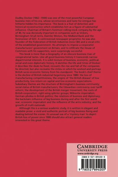 Dudley Docker (1862 1944) was one of the most powerful European businessmen of his era, through his secretiveness and taste for intrigue served to obscure his importance. This book is a feat of detection and historical reconstruction which establishes him as a figure of substantial influence. Like all good business history it transcends narrow departmental interests. It is a solid mixture of business, economic, political, social and even diplomatic history. It sketches the life and times of Docker: it describes the deals he fixed, recounts the rise and fall of the companies he directed, but also recreates the milieu in which he worked and portrays British socio-economic history from his standpoint. The book's chief theme is the decline of British industrial hegemony since 1880.