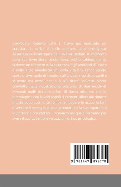 L'avvocato Roberto Salvi si trova suo malgrado ad accettare la carica di socio onorario della prestigiosa Associazione filantropica del Cavalier Bedato. Al momento della sua investitura lancia l'idea, subito caldeggiata, di scrivere un romanzo sulla sicurezza negli ambienti di lavoro e nelle altre manifestazioni della vita.¿ Si rende subito conto di aver agito di impulso sull'onda di ricordi giovanili e si pente ma ormai non può più tirarsi indietro. Verrà coinvolto nella ricostruzione postuma di due incidenti avvenuti molti decenni prima. Si dovrà misurare con le dietrologie e con le voci popolari esistenti allora ma rimaste intatte dopo così tanto tempo. Smuovere le acque lo farà diventare il bersaglio di due attentati ma la sua caparbietà lo porterà a completare il romanzo nel quale finiranno per avere il sopravvento le valutazioni di tipo psicologico.
