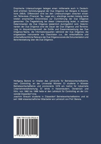 Empirische Untersuchungen belegen einen mittlerweile auch in Deutschland erhöhten Verbreitungsgrad der Due Diligence bei Mergers & Acquisitions (M&A). Differenziert wird bei den Untersuchungen zwischen einzelnen Teilreviews (Financial, Tax, Legal etc.) allerdings wurden bislang keine breiten empirischen Erkenntnisse zur Durchführung der Due Diligence gewonnen. Die Fragestellung bei dieser Untersuchung lautet, in welchen Determinanten die Due Diligence tatsächlich durchgeführt wird. Determinanten der Due Diligence sind die Dauer der Due Diligence und Terminierung im Akquistitionsprozeß, die Größe und Zusammensetzung des Due Diligence-Teams, die Informationsquellen während der Due Diligence, die eingesetzten Instrumente wie Checklisten u.a., die wirtschaftliche und wirtschaftsrechtliche Relevanz der Due Diligence sowie die Dokumentation und Berichterstattung über die Due Diligence.