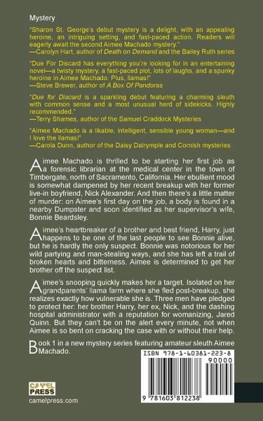 Aimee Machado is thrilled to be starting her first job as a forensic librarian at the medical center in the town of Timbergate, north of Sacramento, California. Her ebullient mood is somewhat dampened by her recent breakup with her former live-in boyfriend, Nick Alexander. And then there's a little matter of murder: on Aimee's first day on the job, a body is found in the hospital Dumpster, soon identified as her supervisor's wife, Bonnie Beardsley. Aimee's heartbreaker of a brother and best friend, Harry, just happens to be one of the last people to see Bonnie alive, but he is hardly the only suspect. Bonnie was notorious for her wild partying and man-stealing ways, and she has left a trail of broken hearts and bitterness. Aimee is determined to get her brother off the suspect list. Aimee's snooping quickly makes her a target. Isolated on her grandparents' llama farm where she fled post-breakup, she realizes exactly how vulnerable she is. Three men have pledged to protect her: her brother Harry, her ex, Nick, and the dashing hospital administrator with a reputation for womanizing, Jared Quinn. But they can't be on the alert every minute, not when Aimee is so bent on cracking the case with or without their help. Book 1 of a new series featuring amateur sleuth Aimee Machado.