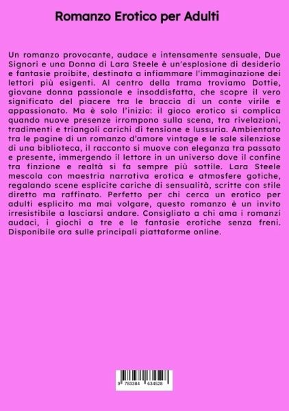 Un romanzo provocante, audace e intensamente sensuale, Due Signori e una Donna di Lara Steele è un'esplosione di desiderio e fantasie proibite, destinata a infiammare l'immaginazione dei lettori più esigenti. Al centro della trama troviamo Dottie, giovane donna passionale e insoddisfatta, che scopre il vero significato del piacere tra le braccia di un conte virile e appassionato. Ma è solo l'inizio: il gioco erotico si complica quando nuove presenze irrompono sulla scena, tra rivelazioni, tradimenti e triangoli carichi di tensione e lussuria. Ambientato tra le pagine di un romanzo d'amore vintage e le sale silenziose di una biblioteca, il racconto si muove con eleganza tra passato e presente, immergendo il lettore in un universo dove il confine tra finzione e realtà si fa sempre più sottile. Lara Steele mescola con maestria narrativa erotica e atmosfere gotiche, regalando scene esplicite cariche di sensualità, scritte con stile diretto ma raffinato. Perfetto per chi cerca un erotico per adulti esplicito ma mai volgare, questo romanzo è un invito irresistibile a lasciarsi andare. Consigliato a chi ama i romanzi audaci, i giochi a tre e le fantasie erotiche senza freni. Disponibile ora sulle principali piattaforme online.