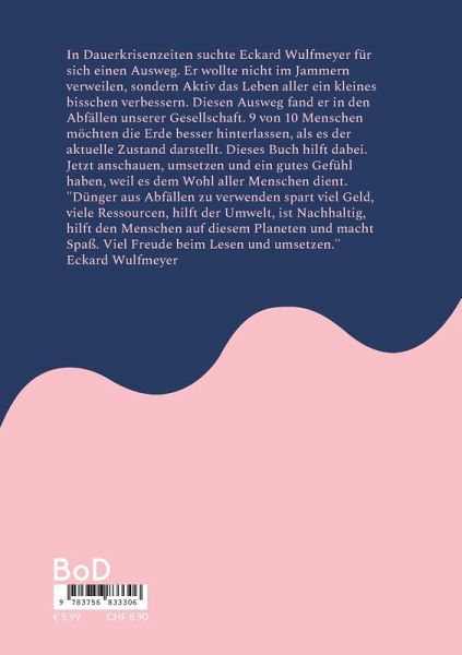 "Dünger aus Abfällen zu verwenden spart viel Geld, viele Ressourcen, hilft der Umwelt, ist Nachhaltig, hilft den Menschen auf diesem Planeten und macht Spaß. Viel Freude beim Lesen und umsetzen." (Eckard Wulfmeyer)In Dauerkrisenzeiten suchte Eckard Wulfmeyer für sich einen Ausweg. Er wollte nicht im Jammern verweilen, sondern Aktiv das Leben aller ein kleines bisschen verbessern. Diesen Ausweg fand er in den Abfällen unserer Gesellschaft. 9 von 10 Menschen möchten die Erde besser hinterlassen, als es der aktuelle Zustand darstellt. Dieses Buch hilft dabei. Jetzt anschauen, umsetzen und ein gutes Gefühl haben, weil es dem Wohl aller Menschen dient.