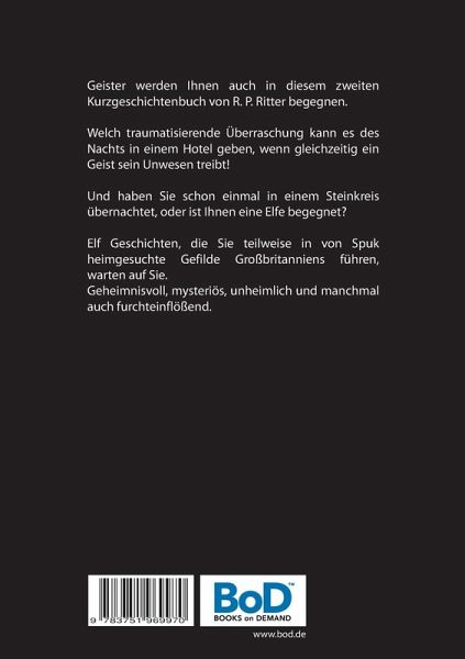 Geister werden Ihnen auch in diesem zweiten Kurzgeschichtenbuch von R. P. Ritter begegnen. Welch traumatisierende Überraschung kann es des Nachts in einem Hotel geben, wenn gleichzeitig ein Geist sein Unwesen treibt! Und haben Sie schon einmal in einem Steinkreis übernachtet, oder ist Ihnen eine Elfe begegnet? Elf Geschichten, die Sie teilweise in von Spuk heimgesuchte Gefilde Großbritanniens führen, warten auf Sie. Geheimnisvoll, mysteriös, unheimlich und manchmal auch furchteinflößend.