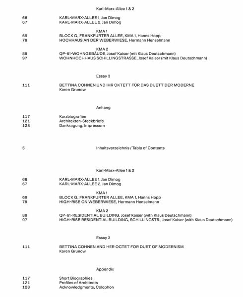 "Auf 128 Seiten mit 80 Farbabbildungen spürt Cohnen der Idee der Nachkriegsmoderne nach: gute, bezahlbare Wohnungen für alle - sowohl in der sozialistischen Karl-Marx-Allee als auch im westlichen Hansaviertel." (Sarah Alexandra Fechler in: https://www.photoscala.de/2025/03/26/duett-der-moderne-im-mitte-museum-ausstellung-zum-gleichnamigen-fotobuch-von-bettina-cohnen/ (27.03.2025))