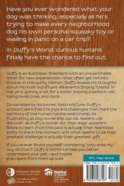 Duffy's World is part memoir, part dog owner’s manual, and narrated primarily from a dog’s point of view. As Duffy’s owner chimes in with her own perspective, readers will recognize their own joys and challenges that mark the territory of the human/canine relationship. From eating anything and everything, to a profound fear of needles and bee stings, to being "released" from dog training school, Duffy’s never-ending zest for new experiences is the source of his owner’s greatest frustration and most profound life lessons.
