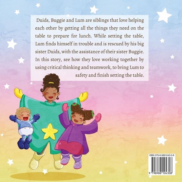 Duids, Buggie and Lum are siblings that love helping each other by getting all the things they need on the table to prepare for lunch. While setting the table, Lum finds himself in trouble and is rescued by his big sister Duids, with the assistance of their little sister, Buggie. In this story, see how these siblings love working together, activating their social connections by using critical thinking, and teamwork, to bring Lum to safety and finish setting the table as a family.