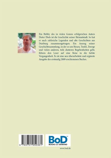 Ein Hobby des in vielen Genres erfolgreichen Autors Dieter Ebels ist die Geschichte seiner Heimatstadt. So hat er auch zahlreiche Legenden und alte Geschichten aus Duisburg zusammengetragen. Ein Auszug seiner Geschichtssammlung, in der es um Hexen, Teufel, Zwerge und vielen anderen, teils dusteren Begebenheiten geht, führen den Leser auf eine Reise in die tiefste Vergangenheit. Es ist eine neu überarbeitete und ergänzte Ausgabe des erstmalig 2009 erschienenen Buches.