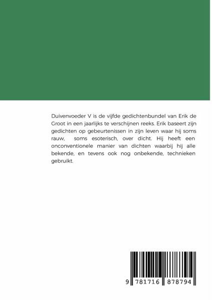 Duivenvoeder V is de nieuwe gedichtenbundel van Erik de Groot in een jaarlijks te verschijnen reeks. Gedichten schrijven is een uitlaatklep voor hem om de dagelijkse beslommeringen te verwerken. Dit doet op hij op een onconventionele manier, soms rauw, soms esoterisch, waarbij alle bekende en tevens nog onbekende dichttechnieken gebruikt.