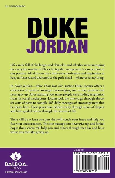 Life can be full of challenges and obstacles, and whether we're managing the everyday routine of life or facing the unexpected, it can be hard to stay positive. All of us can use a little extra motivation and inspiration to keep us focused and dedicated to the path ahead-whatever it may bring. In Duke Jordan-More Than Just Air, author Duke Jordan offers a collection of positive messages encouraging you to stay positive and never give up! After realizing how many people were finding inspiration from his social media posts, Jordan took the time to go through almost six years of posts to compile 365 daily messages of encouragement that he shares here. These posts have helped many through times of despair and have guided others through the storms of life. There will be at least one post that will touch your heart and help you face your circumstances. The core message is to never give up, and Jordan hopes these words will help you and others through that day and hour where you feel like giving up.