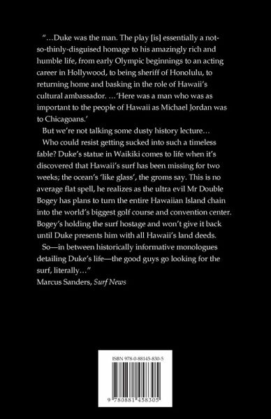 "…Duke was the man. The play [is] essentially a not-so-thinly-disguised homage to his amazingly rich and humble life, from early Olympic beginnings to an acting career in Hollywood, to being sheriff of Honolulu, to returning home and basking in the role of Hawaii’s cultural ambassador. …`Here was a man who was as important to the people of Hawaii as Michael Jordan was to Chicagoans.’ But we’re not talking some dusty history lecture… Who could resist getting sucked into such a timeless fable? Duke’s statue in Waikiki comes to life when it’s discovered that Hawaii’s surf has been missing for two weeks; the ocean’s `like glass’, the groms say. This is no average flat spell, he realizes as the ultra evil Mr Double Bogey has plans to turn the entire Hawaiian Island chain into the world’s biggest golf course and convention center. Bogey’s holding the surf hostage and won’t give it back until Duke presents him with all Hawaii’s land deeds. So—in between historically informative monologues detailing Duke’s life—the good guys go looking for the surf, literally…" Marcus Sanders, Surf News