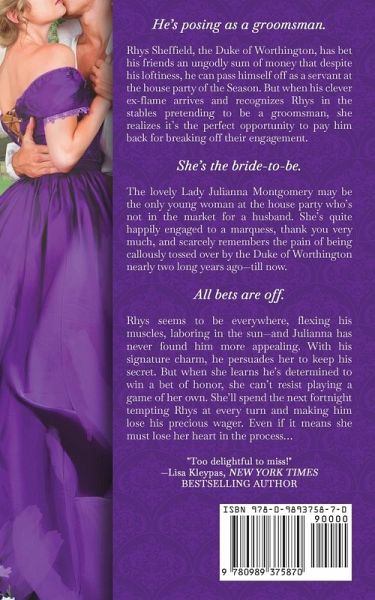 To win a bet with friends, a duke pretends to be a groomsman...then his ex-flame discovers him in the stables, and the lady is bent on revenge. He's posing as a groomsman. Rhys Sheffield, the Duke of Worthington, has bet his friends an ungodly sum of money that despite his loftiness, he can pass himself off as a servant at the house party of the Season. But when his clever ex-flame arrives and recognizes Rhys in the stables pretending to be a groomsman, she realizes it's the perfect opportunity to pay him back for breaking off their engagement. She's the bride to be. The lovely Lady Julianna Montgomery may be the only young woman at the house party who's not in the market for a husband. She's quite happily engaged to a marquess, thank you very much, and scarcely remembers the pain of being callously tossed over by the Duke of Worthington nearly two long years ago-till now.