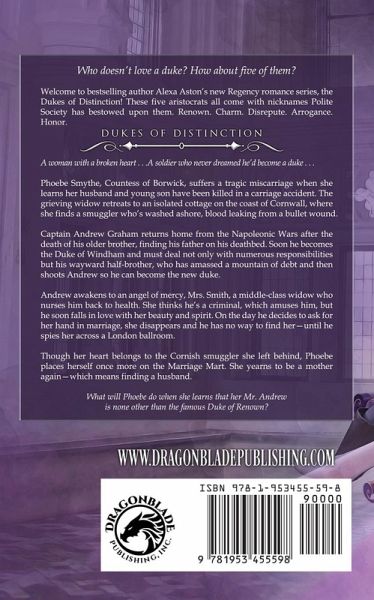 Who doesn't love a duke? How about five of them? Welcome to bestselling author Alexa Aston's new Regency romance series, the Dukes of Distinction! These five aristocrats all come with nicknames Polite Society has bestowed upon them. Renown. Charm. Disrepute. Arrogance. Honor. A woman with a broken heart . . .A soldier who never dreamed he'd become a duke . . . Phoebe Smythe, Countess of Borwick, suffers a tragic miscarriage when she learns her husband and young son have been killed in a carriage accident. The grieving widow retreats to an isolated cottage on the coast of Cornwall, where she finds a smuggler who's washed ashore, blood leaking from a bullet wound. Captain Andrew Graham returns home from the Napoleonic Wars after the death of his older brother, finding his father on his deathbed. Soon he becomes the Duke of Windham and must deal not only with numerous responsibilities but his wayward half-brother, who has amassed a mountain of debt and then shoots Andrew so he can become the new duke. Andrew awakens to an angel of mercy, Mrs. Smith, a middle-class widow who nurses him back to health. She thinks he's a criminal, which amuses him, but he soon falls in love with her beauty and spirit. On the day he decides to ask for her hand in marriage, she disappears and he has no way to find her-until he spies her across a London ballroom. Though her heart belongs to the Cornish smuggler she left behind, Phoebe places herself once more on the Marriage Mart. She yearns to be a mother again-which means finding a husband. What will Phoebe do when she learns that her Mr. Andrew is none other than the famous Duke of Renown?