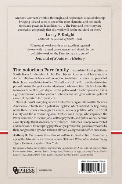 2018 Texas State Historical Association's Al Lowman Memorial Prize, Best Book on Texas county and local history The notorious Parr family manipulated local politics in South Texas for decades. Archie Parr, his son George, and his grandson Archer relied on violence and corruption to deliver the votes that propelled their chosen candidates to office. The influence of the Parr political machine peaked during the 1948 senatorial primary, when election officials found the infamous Ballot Box 13 six days after the polls closed. That box provided a slim eighty-seven-vote lead to Lyndon B. Johnson, initiating the national political career of the future U.S. president. Dukes of Duval County begins with Archie Parr's organization of the Mexican American electorate into a potent voting bloc, which marked the beginning of his three-decade campaign for control of every political office in Duval County and the surrounding area. Archie's son George, who expanded the Parrs' dominion to include jobs, welfare payments, and public works, became a county judge thanks to his father's influence-but when George was arrested and imprisoned for accepting payoffs, only a presidential pardon advocated by then-congressman Lyndon Johnson allowed George to take office once more. Further legal misadventures haunted George and his successor, Archer, but in the end it took the combined force of local, state, and federal governments and the courageous efforts of private citizens to overthrow the Parr family. In this first comprehensive study of the Parr family's political activities, Anthony R. Carrozza reveals the innermost workings of the Parr dynasty, a political machine that drove South Texas politics for more than seventy years and critically influenced the course of the nation.