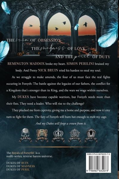 The ruin of obsession, the madness of love, and the peril of duty. Remington Maddox broke my heart. Simon Perilini bruised my body. And Pretty Nick Bruin tried his hardest to steal my soul. As we struggle to make amends, the four of us must face the real fights occurring in Forsyth: The battle against the legacies of our fathers, the conflict for a Kingdom that's stronger than its King, and the wars we wage within ourselves. My Dukes have become capable warriors, but Forsyth needs more than their fists. They need a leader. Who will rise to the challenge? They plucked me from captivity, giving me a home and purpose, and now it's my turn to fight for them. The fury of Forsyth will burn hot enough to melt my cage. And my Dukes will forge a crown from it. Dukes of Peril is book 6 in the contemporary, dark romance, Royals of Forsyth U series by best-selling authors, Angel Lawson and Samantha Rue.