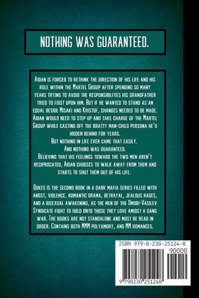 Aidan is forced to rethink the direction of his life and his role within the Martel Group after spending so many years trying to avoid the responsibilities his grandfather tried to foist upon him. But if he wanted to stand as an equal beside Misaki anad Kristof,changes needed to be made. Aidan would need to step up and take charge of the Martel Group while casting off the bratty man-child persona he'd hodden behind for years. But nothing in life ever came that easily. And nothing was guaranteed. Believing that his feelings toward the two men weren't reciprocated, Aidan chooses to walk away from them adn starts to shut them out of his life. Dukes is the second book in a dark mafia series filled with angst, violence, romantic drama, betrayal, jealous rages, and a bisexual awakening, as the men of the Omori-Vasilev Syndicate fight to hold onto those they love amidst a gang war. The books are not standalone and must be read in order.Contains both MMM polyamory and MM romances.