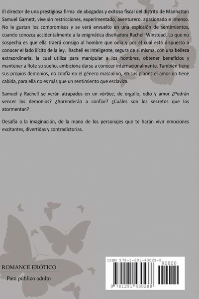 El director de una prestigiosa firma de abogados y exitoso fiscal del distrito de Manhattan Samuel Garnett, vive sin restricciones, experimentado, aventurero, apasionado e intenso. No le gustan los compromisos y se verá envuelto en una explosión de sentimientos, cuando conozca accidentalmente a la enigmática diseñadora Rachell Winstead. Lo que no sospecha es que ella traerá consigo al hombre que odia y por el cual está dispuesto a conocer el lado ilícito de la ley. Rachell es inteligente, segura de sí misma, con una belleza extraordinaria, la cual utiliza para manipular a los hombres, obtener beneficios y mantener a flote su sueño, ambiciona darse a conocer internacionalmente. También tiene sus propios demonios, no confía en el género masculino, en sus planes el amor no tiene cabida, para ella no es más que un sentimiento que esclaviza. Samuel y Rachell se verán atrapados en un vórtice, de orgullo, odio y amor ¿Podrán vencer los demonios? ¿Aprenderán a confiar? ¿Cuáles son los secretos que los atormentan?