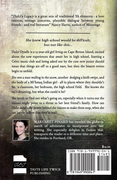 She knew high school would be difficult, but not like this...Dulci Oyselle is a 13-year-old girl living on Cape Breton Island, excited about the new experiences that await her in high school. Starting a Celtic music club and being asked out by the cute new junior should mean that things are off to a good start, but then the bizarre events begin to unfold.She sees a man wailing in the snow, another dodging a knife swipe, and the body of a Mi'kmaq Indian girl--all in places where they shouldn't be: a classroom, her bedroom, the high school field. She knows she isn't dreaming, but what else could it be?She needs to find out what's going on, especially when it turns out the visions might point to a threat to her best friend's family. How can Dulci satisfy the power behind the visions to make them stop, when she can barely believe that they're real?