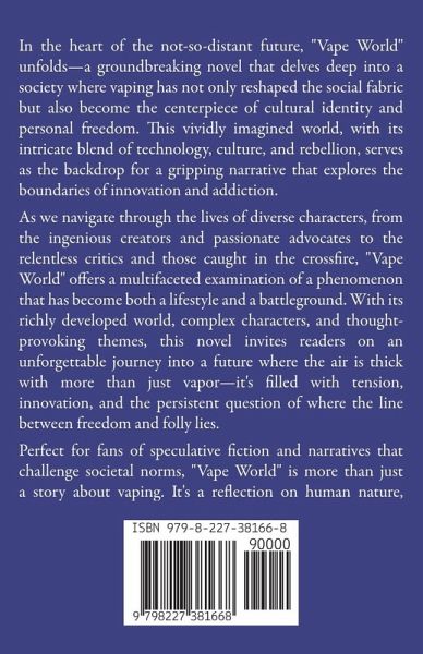 In the heart of the not-so-distant future, "Vape World" unfolds-a groundbreaking novel that delves deep into a society where vaping has not only reshaped the social fabric but also become the centerpiece of cultural identity and personal freedom. This vividly imagined world, with its intricate blend of technology, culture, and rebellion, serves as the backdrop for a gripping narrative that explores the boundaries of innovation and addiction. As we navigate through the lives of diverse characters, from the ingenious creators and passionate advocates to the relentless critics and those caught in the crossfire, "Vape World" offers a multifaceted examination of a phenomenon that has become both a lifestyle and a battleground. With its richly developed world, complex characters, and thought-provoking themes, this novel invites readers on an unforgettable journey into a future where the air is thick with more than just vapor-it's filled with tension, innovation, and the persistent question of where the line between freedom and folly lies. Perfect for fans of speculative fiction and narratives that challenge societal norms, "Vape World" is more than just a story about vaping. It's a reflection on human nature, technology's grip on society, and the lengths to which we go to assert our identity and beliefs. Dive into "Vape World" and immerse yourself in a story that is as provocative as it is enlightening-a narrative that resonates deeply in a world teetering on the edge of tomorrow.