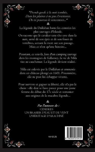 La légende du Dullahan hante les contrées les plus sauvages d'Irlande. On raconte que le cavalier sans tête erre dans la nuit, armé de son épée et de son fouet de vertèbres, semant la mort sur son passage. Mais ce n'est qu'une histoire...Pourtant, cette nuit-là, lors d'un camping sauvage dans les montagnes de Killarney, la vie de Mila vire au cauchemar. La légende devient réalité.Mila est enlevée par le Dullahan et emmenée dans un château plongé en 1601. Prisonnière, elle ne peut lui échapper vivante.Pour survivre et gagner sa liberté, elle n'a pas le choix : elle doit se faire passer pour une jeune femme du début du 17e siècle et remonter aux origines de la macabre légende...