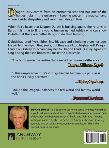 Dragon Fairy comes from an enchanted star and has one of the hardest jobs in the universe ? keeping peace in a magical land where a rude, disgusting and very mean dragon lives. When Fairy hears that Dragon Duluth is bullying again, she returns to Earth; this time to find a young human named Ashley who can show Duluth that there are better things to do than bullying. Duluth has lured five children into his cave and is holding them hostage. He will let them go if they smile, but they are all too frightened! Dragon Fairy asks Ashley to accompany her to Dragon Land. Ashley agrees to sing a song that she hopes will make the kids smile. ?The book made me realize that one kid can make a difference.? ?Lauren Zillmer, Age 8 ??this simple adventure?s strong-minded heroine is a plus, as is the book?s lively narrative.? ?Kirkus Reviews ?Duluth the Dragon?balances the real world and fantasy world well.? ?Foreword Reviews