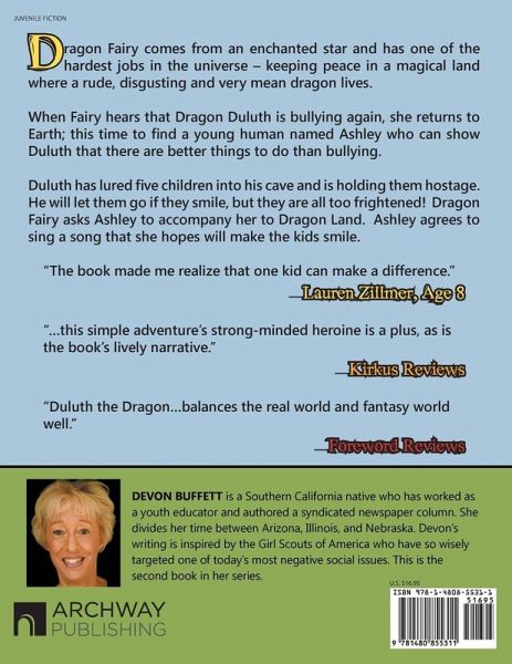 Dragon Fairy comes from an enchanted star and has one of the hardest jobs in the universe ? keeping peace in a magical land where a rude, disgusting and very mean dragon lives. When Fairy hears that Dragon Duluth is bullying again, she returns to Earth; this time to find a young human named Ashley who can show Duluth that there are better things to do than bullying. Duluth has lured five children into his cave and is holding them hostage. He will let them go if they smile, but they are all too frightened! Dragon Fairy asks Ashley to accompany her to Dragon Land. Ashley agrees to sing a song that she hopes will make the kids smile. ?The book made me realize that one kid can make a difference.? ?Lauren Zillmer, Age 8 ??this simple adventure?s strong-minded heroine is a plus, as is the book?s lively narrative.? ?Kirkus Reviews ?Duluth the Dragon?balances the real world and fantasy world well.? ?Foreword Reviews