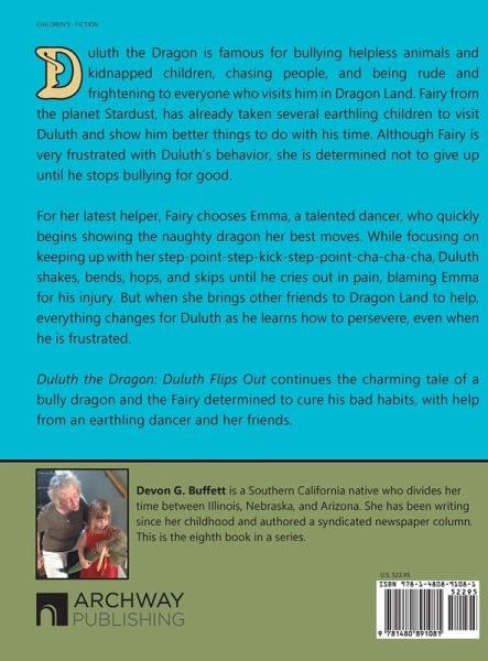 Duluth the Dragon is famous for bullying helpless animals and kidnapped children, chasing people, and being rude and frightening to everyone who visits him in Dragon Land. Fairy from the planet Stardust, has already taken several earthling children to visit Duluth and show him better things to do with his time. Although Fairy is very frustrated with Duluth's behavior, she is determined not to give up until he stops bullying for good. For her latest helper, Fairy chooses Emma, a talented dancer, who quickly begins showing the naughty dragon her best moves. While focusing on keeping up with her step-point-step-kick-step-point-cha-cha-cha, Duluth shakes, bends, hops, and skips until he cries out in pain, blaming Emma for his injury. But when she brings other friends to Dragon Land to help, everything changes for Duluth as he learns how to persevere, even when he is frustrated. Duluth the Dragon: Duluth Flips Out continues the charming tale of a bully dragon and the Fairy determined to cure his bad habits, with help from an earthling dancer and her friends.